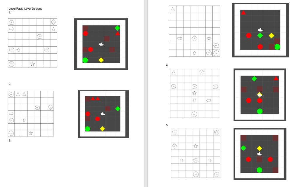 Design Problems = provided design above was physically impossible to win the game. I had to change the design completely to make it playable. I had to remove one triangle enemy due to the mechanic being ‘too overpowered’ (following the player) if two follow a player from either direction, the player will always be caught, especially with new obstacle.