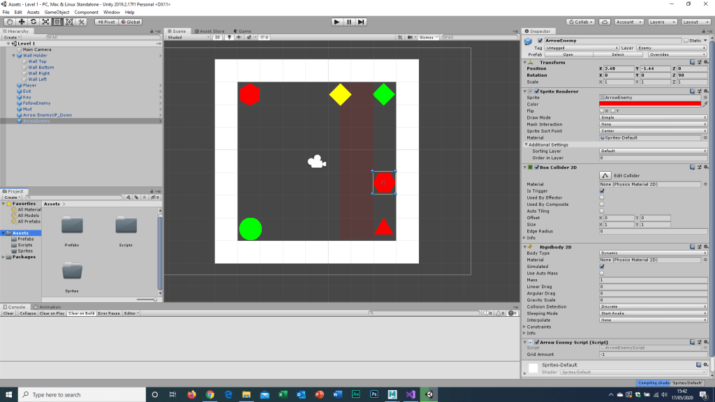 As you can see I have not only designed my levels out on paper, but I have also make a working mechanical demo of the game itself. This took a lot of effort with a lot of help from coding experts on Youtube and the Unity Forum (very helpful sites when doing projects). Once I was able to build this demo the first thing I did was make the level provided. Not only was there no possible winning outcome, the player couldn’t move more than three times before coming into contact with an enemy. In order to fix this I had to get rid of one of the triangular enemies, which allowed me to win the game (and will allow other players to win it too).